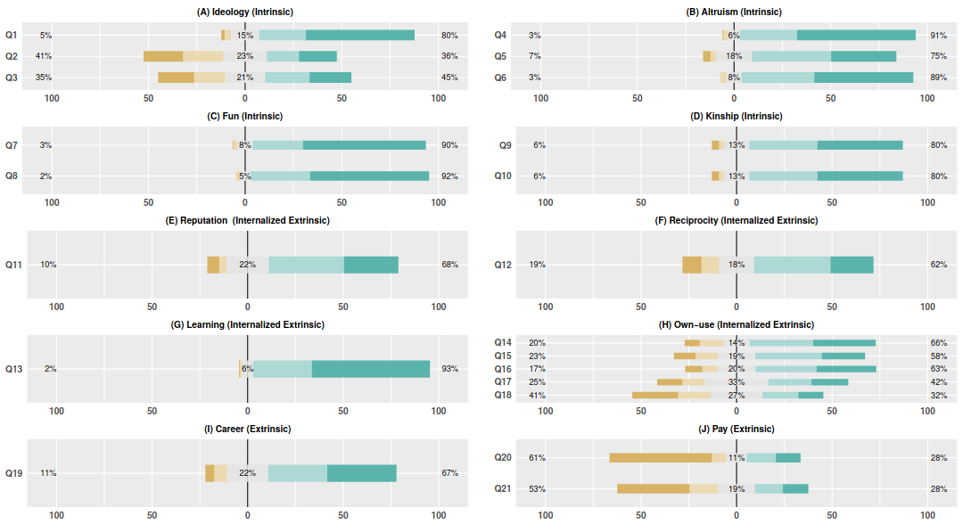 Motivations des contributeurs open source (le bleu/vert représente l’accord, le jaune le désaccord). Extrait de Gerosa et al. (2021).